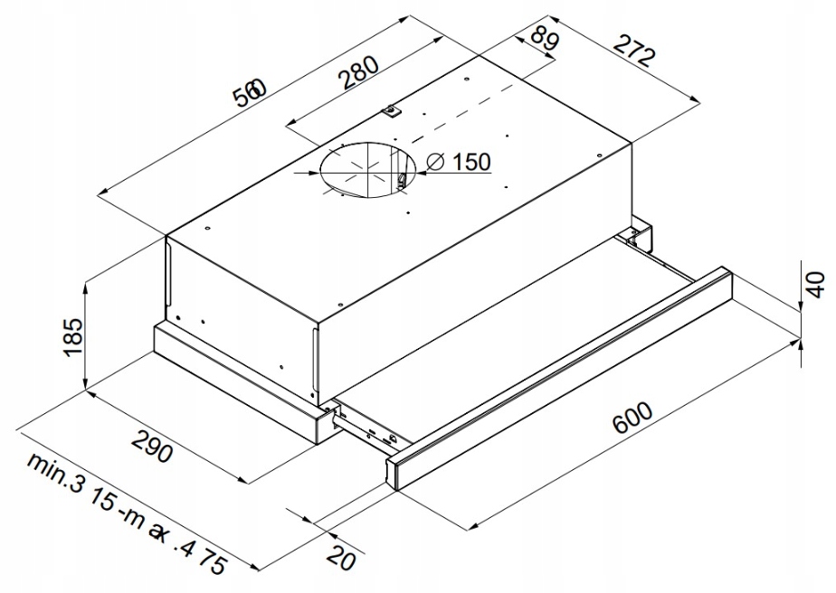 - Wymiary (W x S x G) mm: 185 x 600 x 310-480 mm
